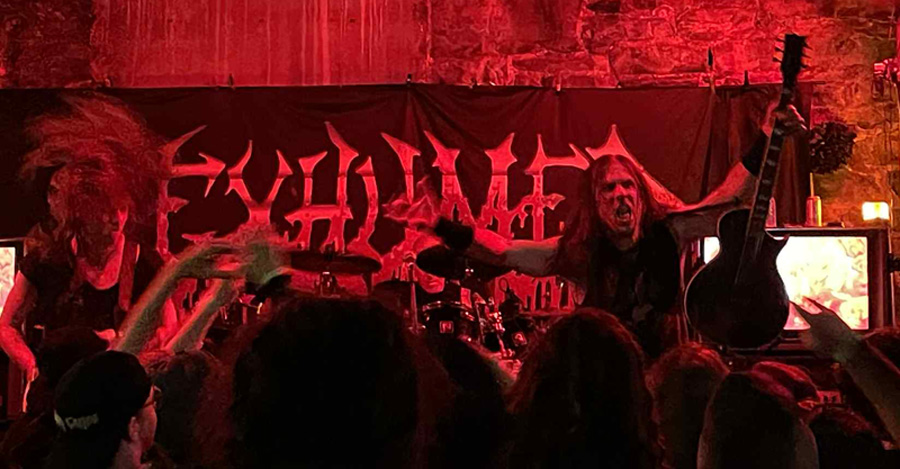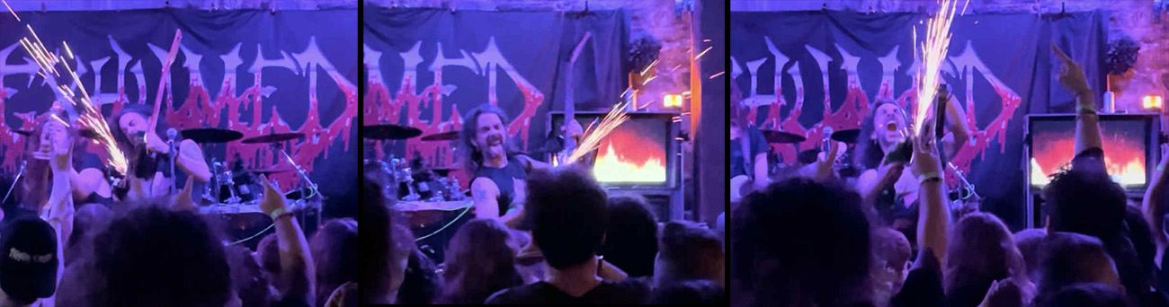 Among a historical railroad hub along the surrounding James River that is the twists and turns of downtown Lynchburg, Virginia, lurks a currently growing hotspot for extreme and raucous music. That is undoubtedly no other place than Super Rad Arcade. A calm chill in the air on a fading early sunset commenced the mood for a very abrasive night. Get ready, player one; no quarters needed and the head banging is free and infectiously unpreventable. Originally booked as a 4 band gig, not a single second was wasted. Washington D.C.s very own No/Mas kicked and stomped into a non-crowd killing frenzy with their very own energetic Death/Grind resistance. The social awareness rang strong throughout the set with an obvious anti-ICE agenda as No/Mas completely pulverized the crowd sonically along with maybe a sharp elbow or three. The hammering set ended with the appropriate and affective Bad Brains cover "Banned in D.C.", instructing a lesson in mobility when the beats are blasting. Washing ashore from Americas West Coast, and possibly Japan--Oxygen Destroyer (minus a bassist) released atomic breath into the crowd for their very own Brutal Thrashing Kaiju Metal. The Hill City came crashing down into the dark basement stage amidst continues and extra lives from blistering speed, monstrous riffs, and bestial savagery rampaging between shrieky song announcements. ![]() Only red asphalt is real and after 20+ years on that long and grinding road, Exhumed exude why they are the reigning gods of Gore Metal. Adorning the newly renovated stage with caution lights and car crash videos to set the romantic mood, long time lifer (barfer? No, they don't do that anymore) Matt Hardy began the hack, maim, and kill as good if not better than his contemporaries yet still having an 80's performance spirit. "Hall of the Mountain King" sound check can't be denied, for it is not allowed. Any doubters can face the road rash and simply be wrong. A duel between Ross Sewage on the grinder and guitarist Sebastian Phillips set the sparks literally flying and blood spilled from a severed head into the lucky contestants in the front row. What other band brings their own bloody stage head all in the name of gore? Armed with no less than a 3-decade arsenal, Exhumed completely obliterated--blood, guts, blast beats, chainsaws, giant beach ball eyes and the ultimate car crash anthem from KISS (Detroit Rock City!) ended the night while only a few red puddles remained. No one in attendance will be the same or forget. Same as that one stuck beach ball eye will never come down from the joists and air vent. See this tour and game on Super Rad Arcade! Links: Facebook.com ![]() Exhumed. Copyright Josh Greer